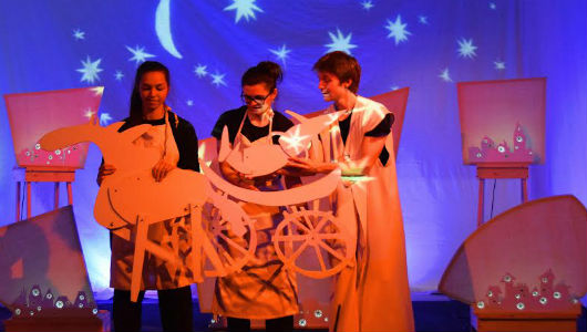 В спектакле используются китайские теневые куклы, современная компьютерная анимация и видеомэппинг.