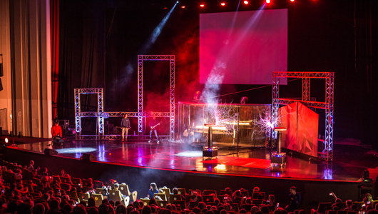 Основное шоу «Безграничная наука» — это масштабные научные демонстрации: эффектные опыты, явления и их объяснение прямо на большой сцене. В день запланированы три таких шоу — можно выбрать удобное время (10:00, 13:00 или 15:00).