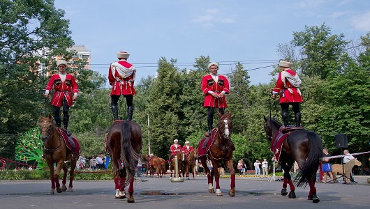 В выступлении задействовано 12 всадников с традиционным вооружением в национальных казачьих костюмах и 14 лошадей исконно российских пород – донской и буденновской.